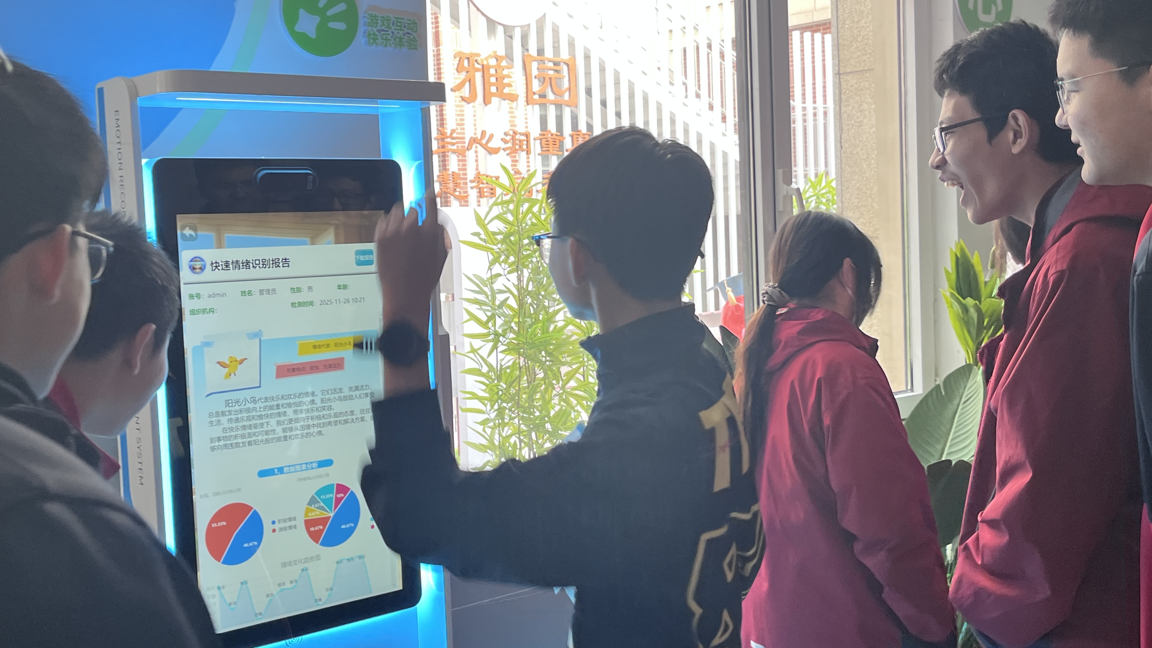 小学生充满好奇,被有趣的设备吸引,在互动中初识情绪;