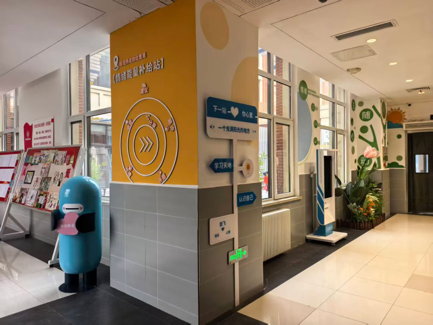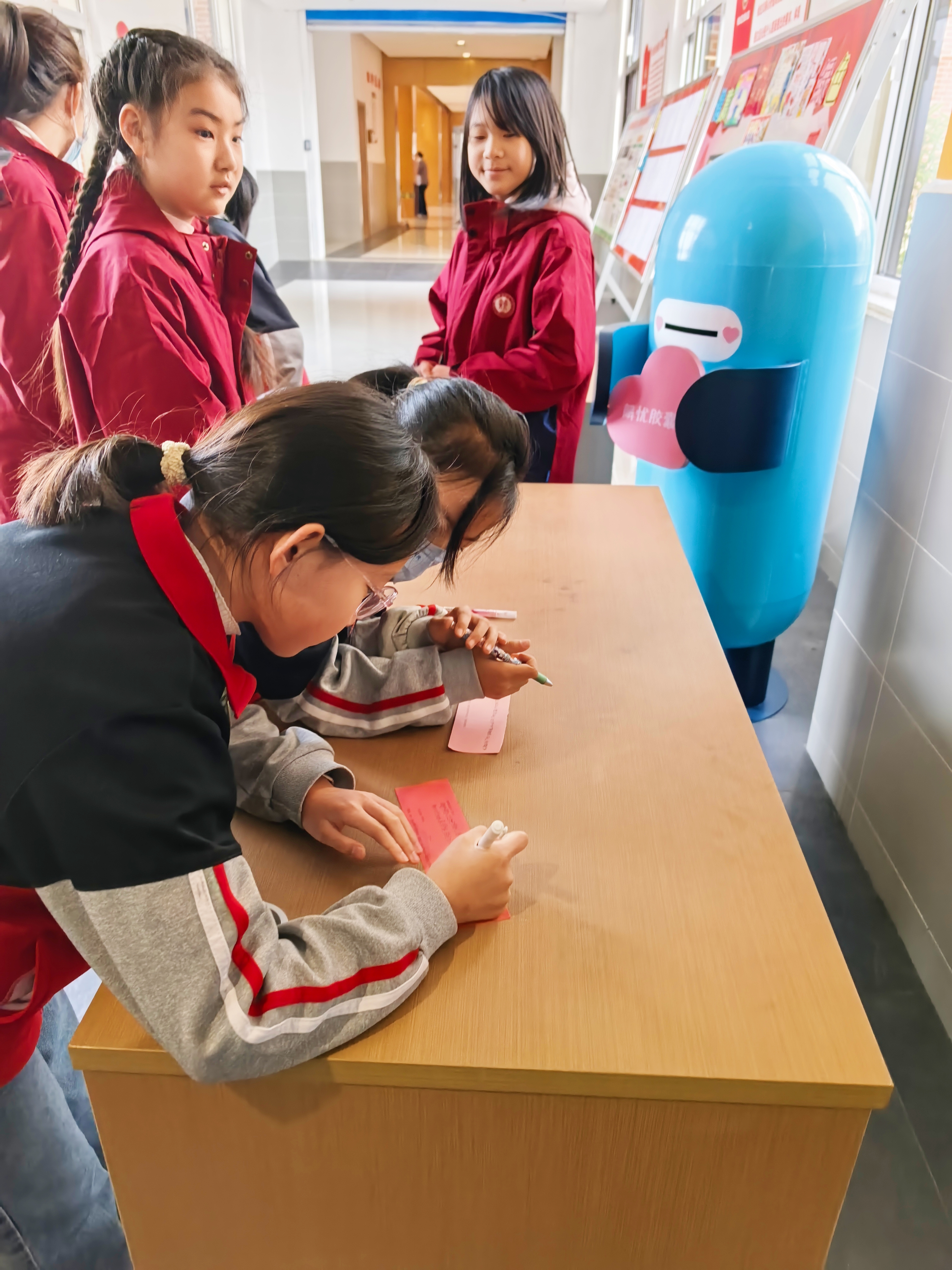 在这里,同学们可以领取特制的"心情卡片",写下自己的快乐、困惑或是烦恼,然后将这些心声装进色彩缤纷的"解忧胶囊"中。投递完成后,每个同学都会收到一枚特别的"回应胶囊",里面装着对应情绪的调节小妙招或是温暖的鼓励话语。