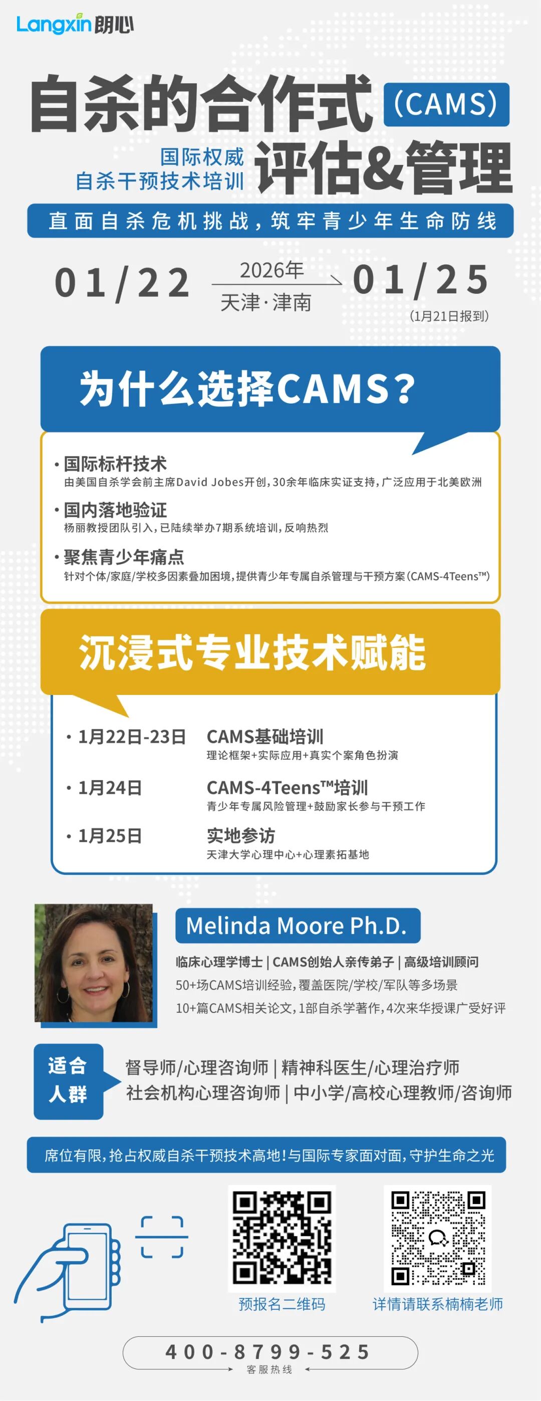 为进一步推进CAMS在国内的广泛应用,继续探索CAMS在青少年自杀危机管理和干预中的效果,在天津大学应用心理研究所和天津市自杀心理与行为研究实验室的学术支持下,北京朗心致远科技有限公司特邀请Melinda Moore教授于2026年1月22日-25日在天津开展新一期CAMS培训。