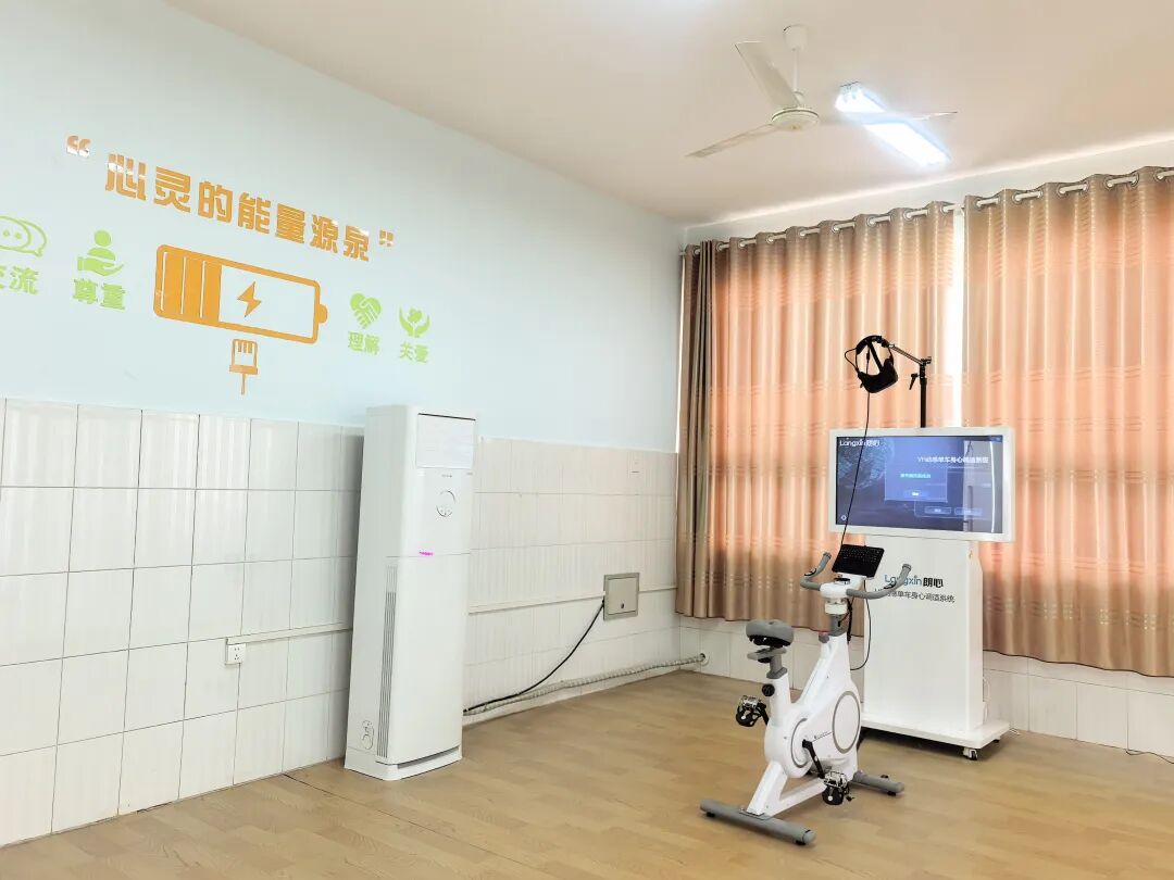 引入前沿科技的心理调适空间。内部配备 VR动感单车身心调试系统,让学生在沉浸式场景中通过运动释放压力;VR心理脱敏训练系统则提供安全可控的虚拟环境,帮助逐步缓解特定焦虑与恐惧,拓展心理适应能力。